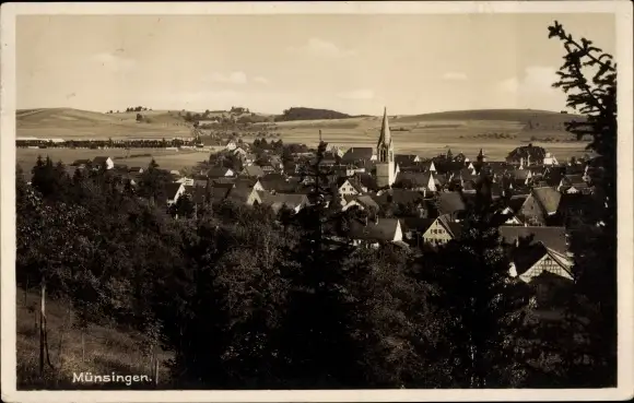 Ak Münsingen in Württemberg, Gesamtansicht, Panorama, Kirche