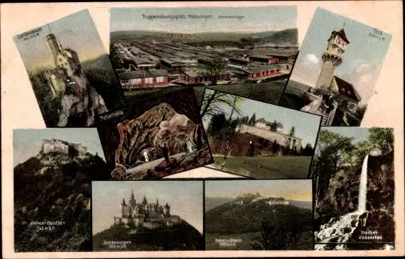 Ak Münsingen in Württemberg, Truppenübungsplatz, Teck, Wasserfall, Schloss, Nebelhöhle