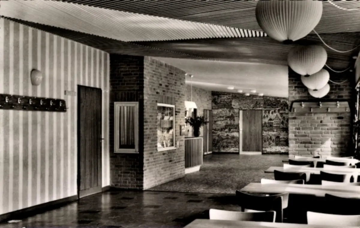 Ak Münster in Westfalen, Innenansicht, Jugendherberge, Tische, Wände mit Tapete, Beleuchtung