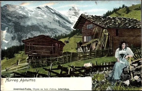 Ak Mürren Kanton Bern, Partie an den Alphütten, Frau in Schweizer Tracht