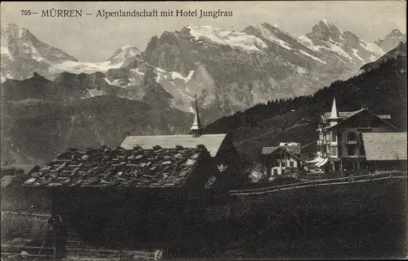 Ak Mürren Kanton Bern Schweiz, Alpenlandschaft mit Hotel Jungfrau