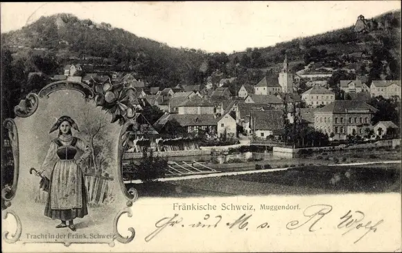 Ak Muggendorf Wiesenttal Fränkische Schweiz, Totale, Frau in Tracht