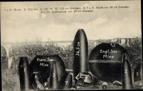 Ak Munition I. WK, Französ. u. engl. Seemine, Granaten, Köpfe und Bruchstücke