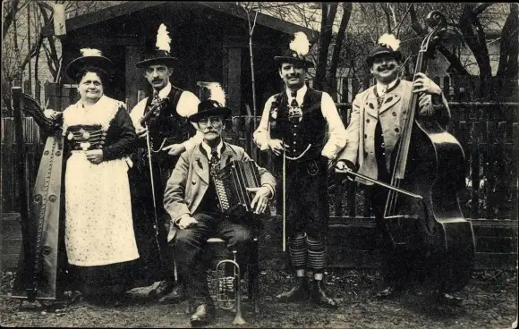 Ak Musik-Kapelle, Musiker in Tracht, Musikinstrumente, Harfe, Kontrabass