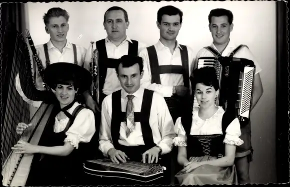 Ak Musikgruppe, Menschen in Tracht, Musikinstrumente, Harfe