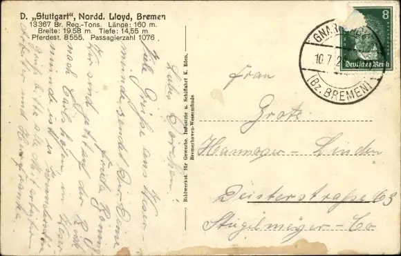 Ak NDL Dampfer Stuttgart, 13367 BRT