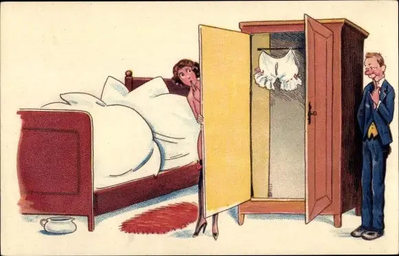 Ak Nackte Frau versteckt sich hinter dem Kleiderschrank, Unterhose