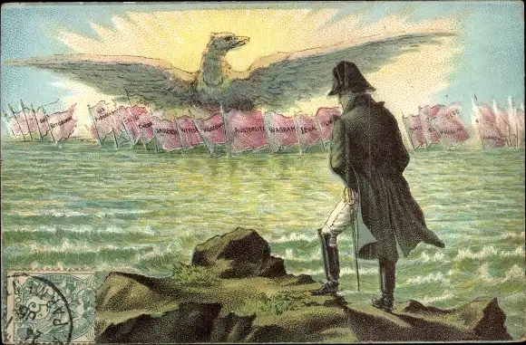 Ak Napoleon Bonaparte, Adler, Fahnen mit Schlachten, Austerlitz, Wagram, Waterloo