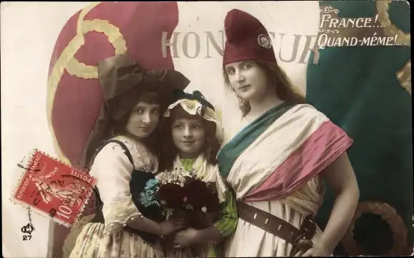 Ak National-Allegorie Frankreich, Elsässer und Lothringer Trachten