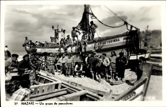 Ak Nazaré Nazareth Portugal, Menschen am Strand, Boot Pastorinha