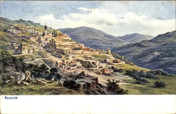 Ak Nazaret Nazareth Israel, Landschaft, Stadtansicht, Berge, Gebäude, Schafe