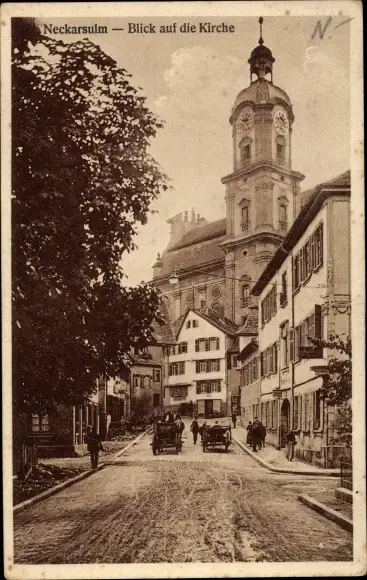 Ak Neckarsulm in Baden Württemberg, Kirche, Straßenpartie