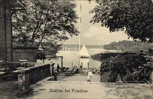 Ak Nedlitz Potsdam in Brandenburg, Gastwirtschaft am Ufer, Terrasse, Segelboote