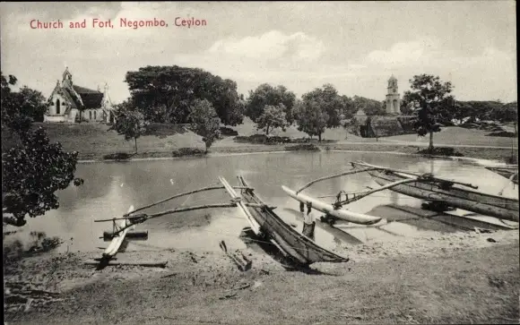 Ak Negombo Ceylon Sri Lanka, Church, Fort, Auslegerkanus