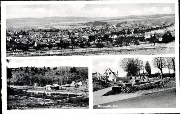 Ak Neu Anspach im Taunus, Gesamtansicht, Schwimmbad, Kriegerdenkmal