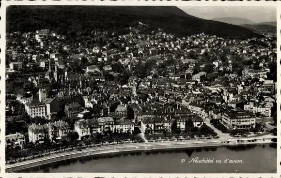 Ak Neuchâtel Neuenburg Stadt, Luftaufnahme von Stadtansicht, Berge im Hintergrund
