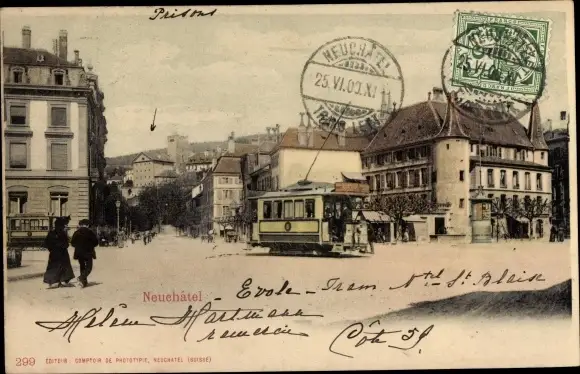 Ak Neuchâtel Neuenburg Stadt, Platz, Passanten, Straßenbahn