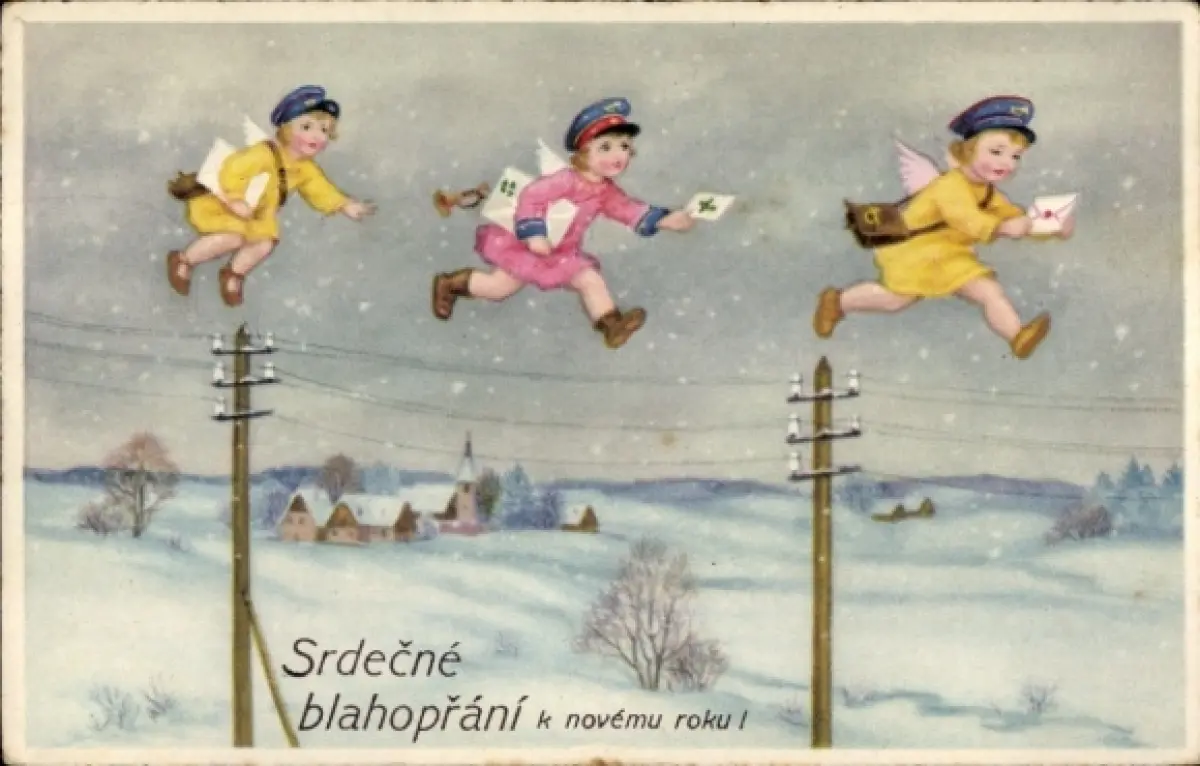 Ak Neujahr, Engel als Postboten, Telefonmasten, Winterlandschaft