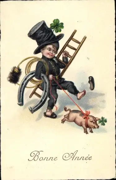 Ak Neujahr, Schornsteinfeger, Klee, Schwein