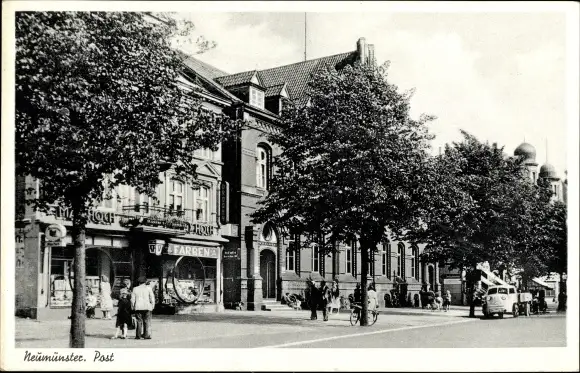 Ak Neumünster in Schleswig Holstein, Straßenpartie, Postamt, Drogerie