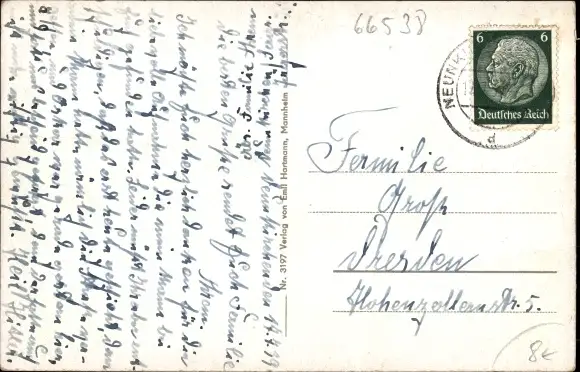 gelaufen 1939, Eckknick rechts oben, Knickspur rechts, sonst guter Zustand