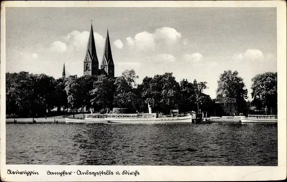 Ak Neuruppin, Blick vom Wasser auf Kirche, Boote