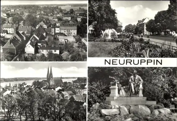 Ak Neuruppin in Brandenburg, Ortsansicht mit Kirche, Denkmal, Springbrunnen