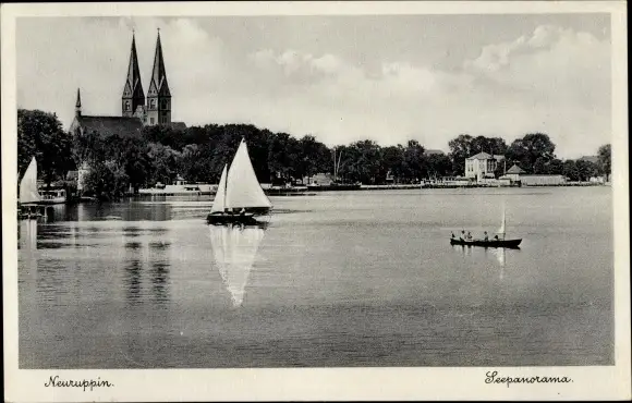 Ak Neuruppin in Brandenburg, Seepanorama, Segelboote, Kirche