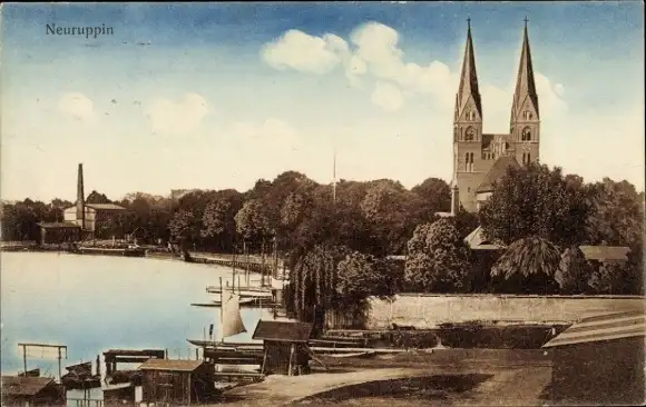 Ak Neuruppin in Brandenburg, Uferpartie mit Blick auf die Kirche