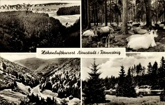 Ak Neustadt am Rennsteig Großbreitenbach in Thüringen, Teilansichten, Kuhherde
