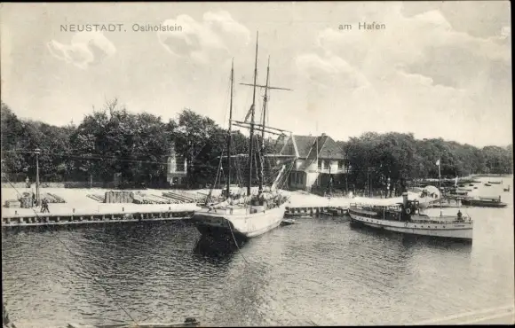 Ak Neustadt in Holstein, Hafen, Segelschiff, Dampfschiff