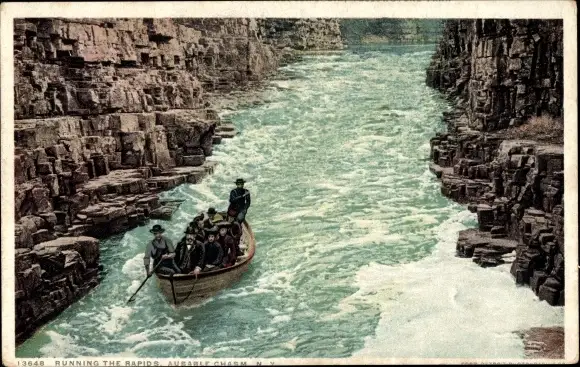 Ak New York USA, Flusspartie, Felsen, Ruderboot