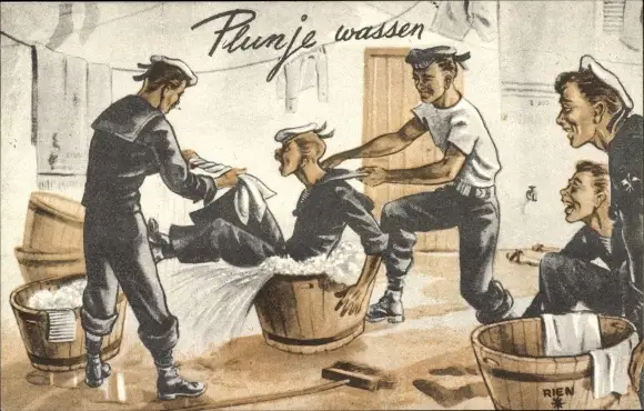 Ak Niederländische Seeleute, Seemann fällt in Waschbottich