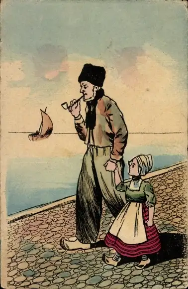 Ak Niederländische Tracht, Rauchender Mann mit Enkeltochter