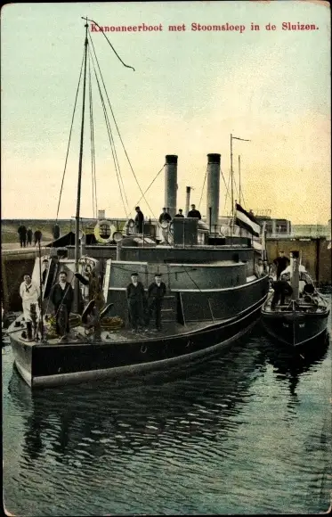 Ak Niederländisches Kriegsschiff, Kanonenboot, Schlepper, Schleuse