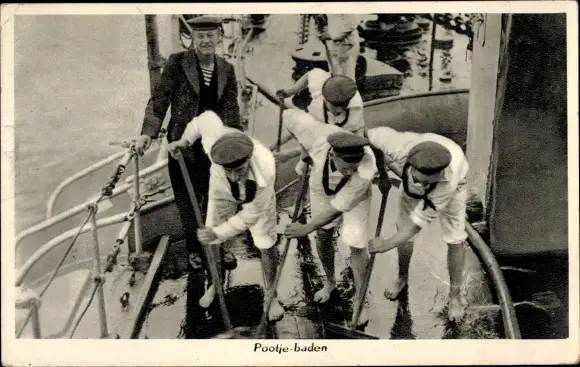 Ak Niederländisches Kriegsschiff, Seeleute schrubben das Deck