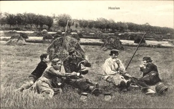 Ak Niederlande, Bauern machen Pause, Heugarben, Werkzeuge