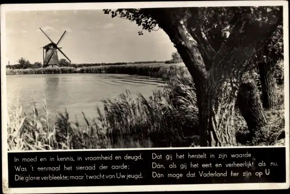 Ak Niederlande, Windmühle, See, Ufer, Gedicht