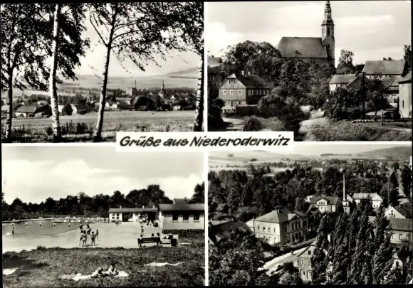 Ak Niederoderwitz Oderwitz in der Oberlausitz, Teilansicht, Ev. Kirche, Volksbad