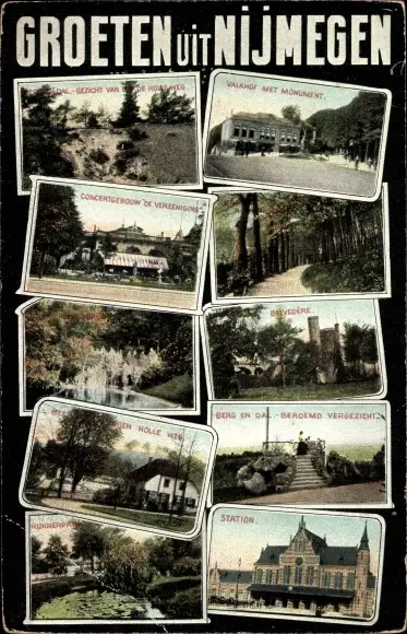 Ak Nijmegen Gelderland, Station, Belvedere, Concertgebouw, Valkhof met Monument, Holle Weg