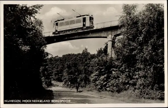 Ak Nijmegen Gelderland, Straßenbahn fährt an der Brücke vorbei