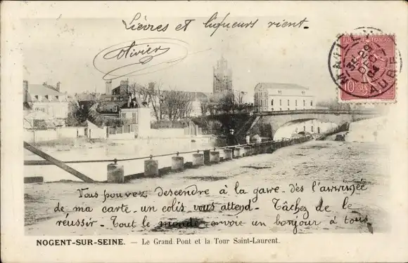 Ak Nogent sur Seine Aube, le Grand Pont et la Tour Saint-Laurent