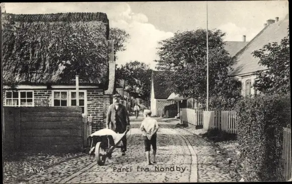 Ak Nondby Fanø Dänemark, Straßenpartie, Mann mit Schubkarre