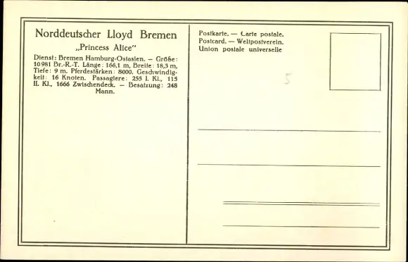 Ak Norddeutscher Lloyd Bremen, Doppelschrauben-Salondampfer Princess Alice
