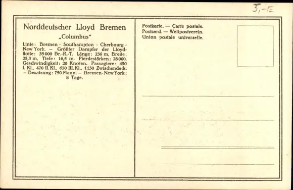 Ak Norddeutscher Lloyd Bremen, Salondampfer Columbus