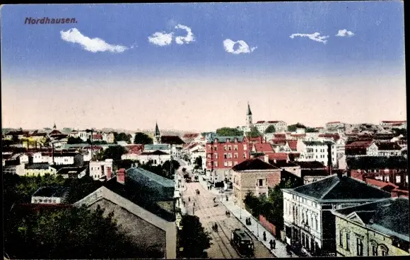 Ak Nordhausen am Harz, Panorama, Kirchturm, Straßenbahn