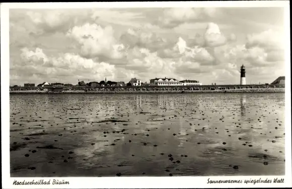 Ak Nordseebad Büsum, Sonnenwarmes spiegelndes Watt, Leuchtturm