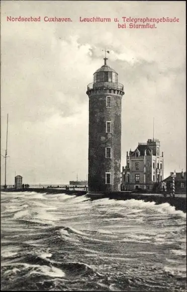 Ak Nordseebad Cuxhaven, Leuchtturm und Telegraphengebäude bei Sturmflut