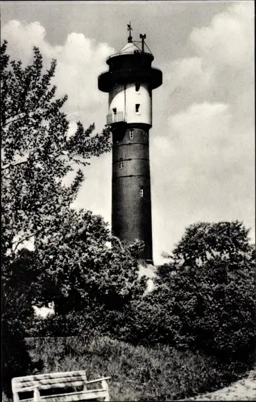 Ak Nordseeheilbad Wangerooge, Blick auf den Leuchtturm, Bäume, Bank