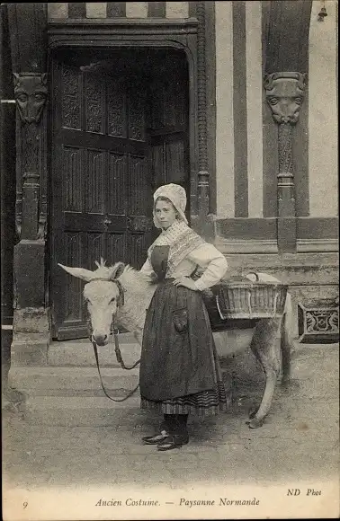 Ak Normandie, Frau in Volkstracht, Esel, Transport